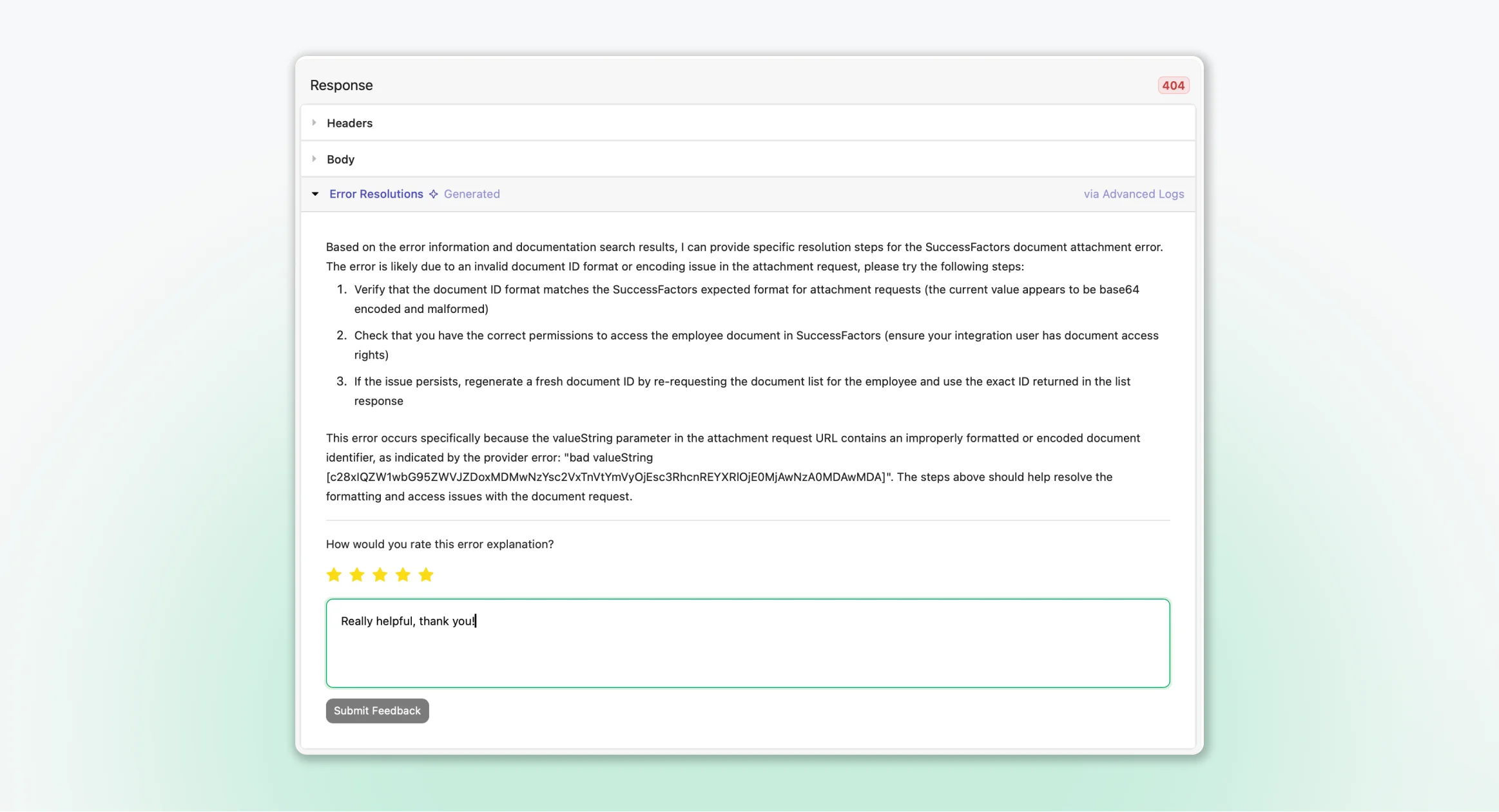 The frontend integration was straightforward, exposing a single endpoint /ai/resolutions that accepts error logs and returns resolution steps.